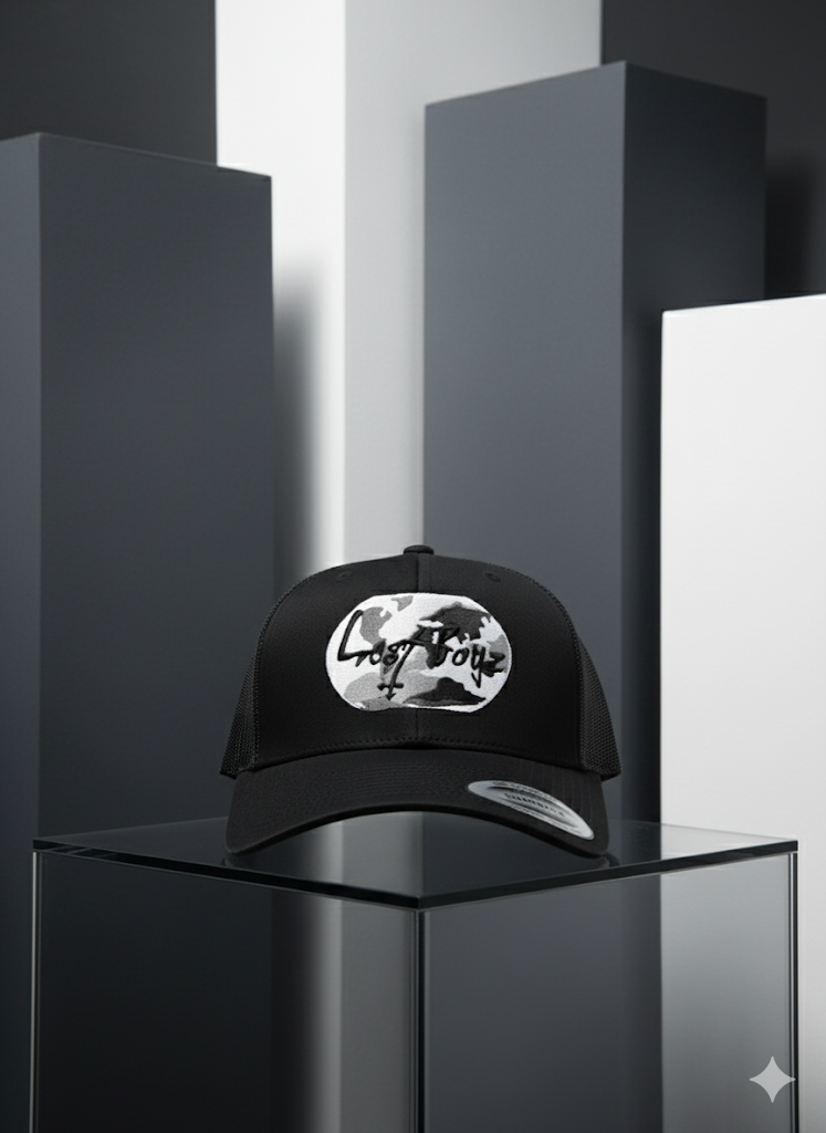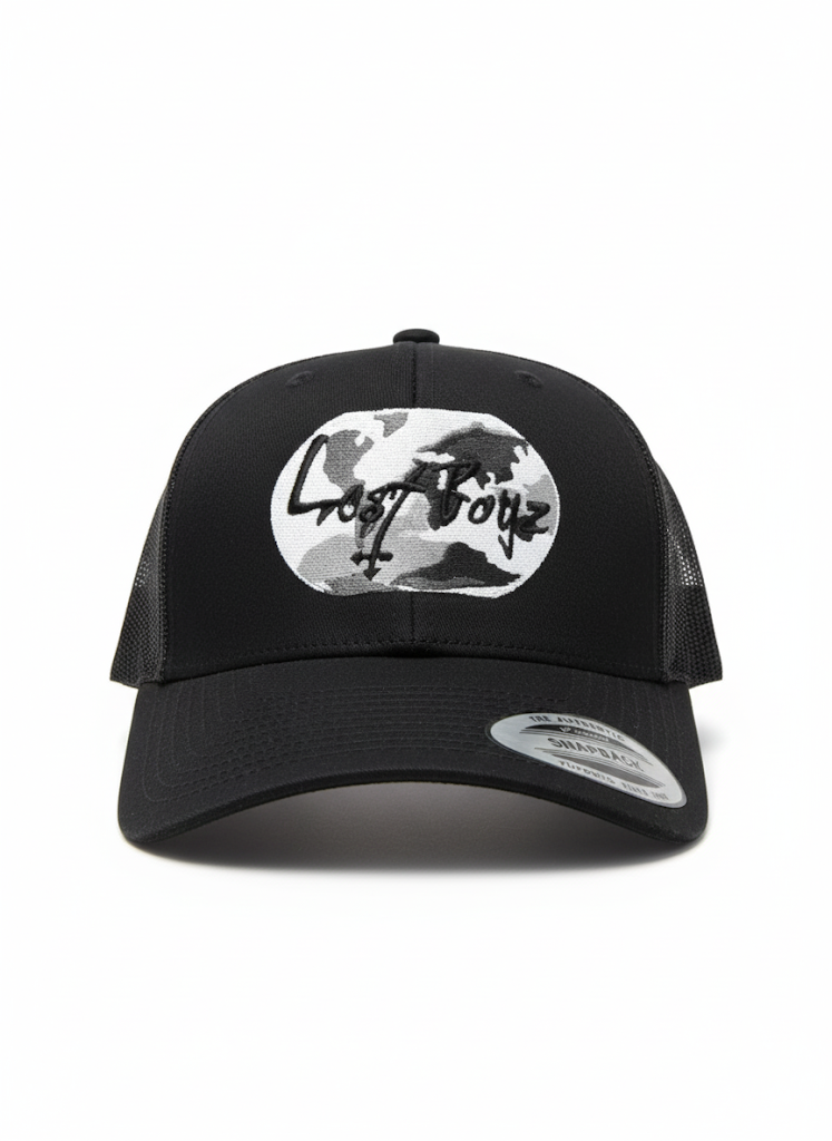 A dark twist on a classic, the OG Noir takes our original design into the shadows. It features our signature "Lost Boyz" script in a striking black-and-white embroidery over a grayscale urban camo patch. This monochrome masterpiece is a versatile essential that pairs with anything.